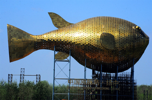 近日,江蘇揚中一座"河豚"巨型雕塑成為網絡熱議話題。這條金光燦燦,搖頭擺尾的"河豚",黃銅披身,是揚中市的新地標,也是9 月27日開幕的第八屆江蘇省園博會的重要標志。僅就其本身的設計而言,足以引人注目乃至贊嘆。然而,不同的聲音在于,傾注7000萬 元巨資興建這樣一個地標,真的值嗎?有網友直言,在中央八項規定、厲行節約等要求和精神下,與"面子工程"相比,民生實事才更加 緊迫。