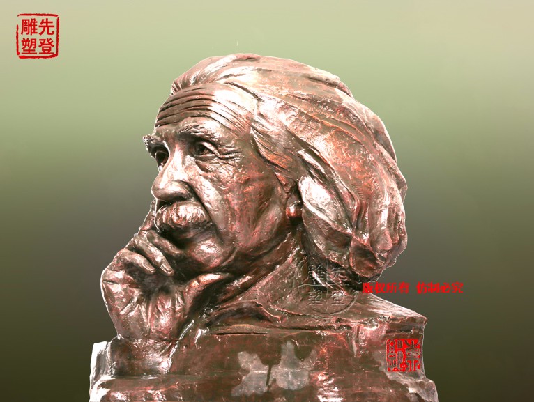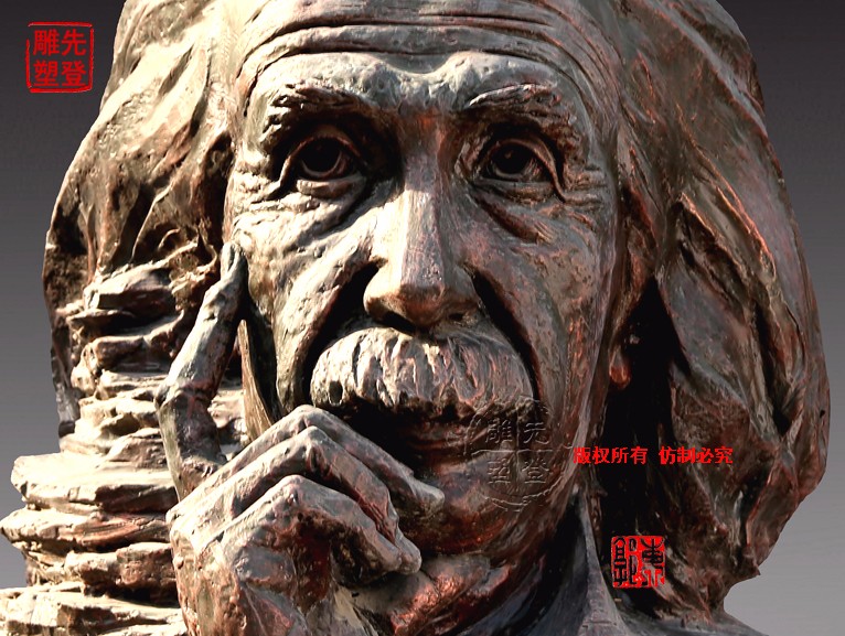 雕塑作品是雕塑家個人內(nèi)心的情感和表達欲望情感的載體、宣揚精神層面的介質(zhì)。愛因斯坦的雕塑塑造的是智慧與仁義的結(jié)合,他的人生在不斷探索、思考中感染著人類。藝術(shù)家索取的就是愛因斯坦散發(fā)出的人格魅力,他是世界的公民,他的愛建立在人道主義情懷之上,不屬于哪一個國度,藝術(shù)家無需精雕細琢,不是色彩的感覺,是內(nèi)蘊情感的流露,猶如匕首刺向偽君子的面具,真實的面對生活,從事嚴謹?shù)目茖W研究。那是什么樣的文化孕育出世紀的偉人,是什么樣的審美心理塑造出的永恒。